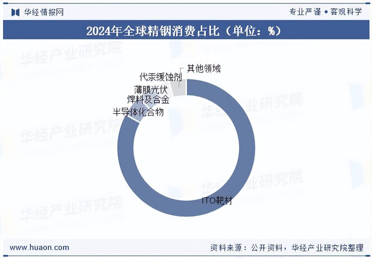 铟作为提升显示性能的关键元素,其应用正随着显示面板行业的技术进步和市场需求的扩大而不断增加,展现出良好且稳定的需求上升趋势。受5G、AI等高新技术产业的带动,铟的半导体化合物材料需求渐起,且随着国内对液态金属、铟镓砷外延等前沿高新材料的技术探索,新材料国产化替代的步伐也在加快。2024年全球精铟消费占比中,ITO靶材消费占比为83%,半导体化合物消费占比为5%。